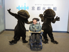オオサンショウウオの男の子、オオさんとショウさんは仲の良い友達同士です。 普段ふたりは水のきれいな京都の鴨川上流で釣りをしたり、お昼寝したりしてのんびり過ごしています。 そんなふたりが出迎えてくれました。 |