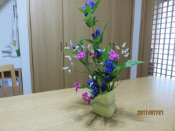 7月21日フラワーセラピー テーマ「朝に残った疲れをとる花たち」 リンドウ・スプレーカーネーション・スターチスをアレンジしました。 朝見て疲れをとります。 |