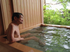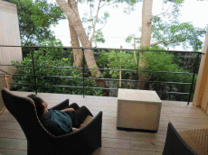 テラスで日光浴です。森の中にいるように木が植わっていてその前には海が見えます。